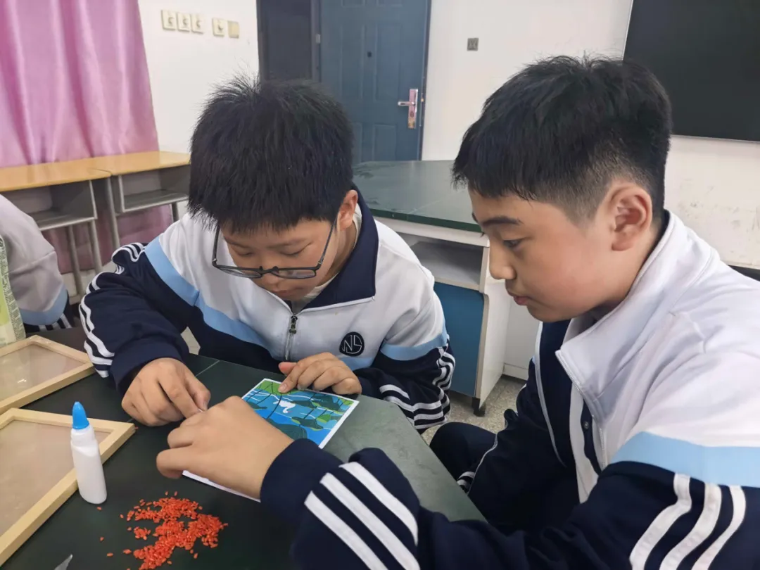 八年级(15)班的同学围绕24节气主题,根据自己在课本上学习的24节气特征,发挥奇思妙想,进行手工创作。从寓意清明的踏青图、芒种的麦穗画,到夏至的荷叶图,再到冬至的雪人画,一件件精美而富有文化内涵的手工作品,在同学们的巧手下逐渐成型。这不仅锻炼了同学们的观察力、想象力,更让他们在制作过程中深刻理解了每个节气的气候特征、农事活动,实现了传统文化与现代美育的有机结合。