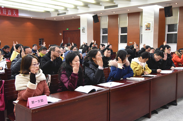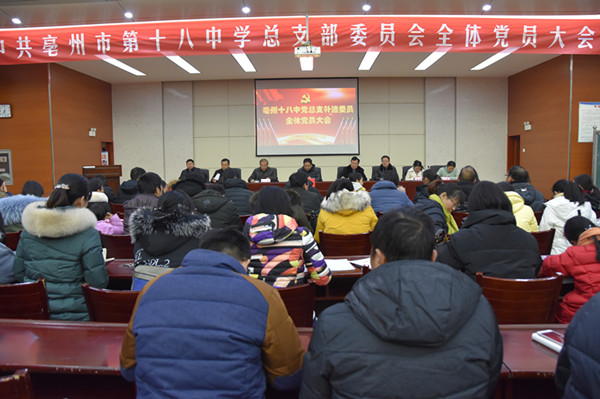 12月11日,亳州十八中党总支召开补选委员全体党员大会,市教育局机关党委专职副书记杨超杰同志应邀到会指导并讲话,亳州十八中党总支副书记、副校长孙德兴主持会议,全体党员积极参加,行使党章赋予的神圣的选举权利。