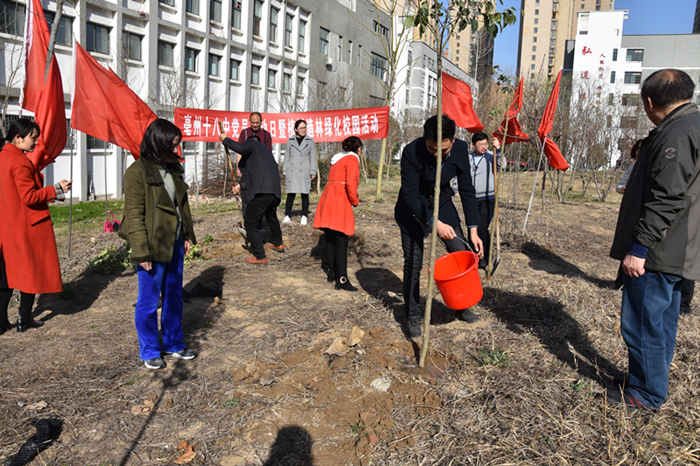 3月12日,第41个全民义务植树节,亳州十八中组织全体党员开展“党员活动日暨植树造林绿化校园活动”。党总支书记、校长吴辉,党总支副书记、副校长孙德兴出席会议,党总支副书记、督导室主任郭飞峰等班子成员参加活动。