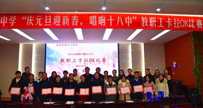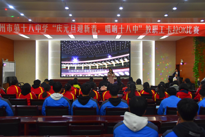 12月6日下午,我校“迎元旦庆新春,唱响十八中”教职工卡拉OK比赛在学校至真厅隆重举行。此次活动由校工会组织,校长吴辉、副校长戴永兴、工会主席王素云等校领导及学校音乐组部分教师担任评委,来自全校各个年级、各处室的11名教师报名参赛。