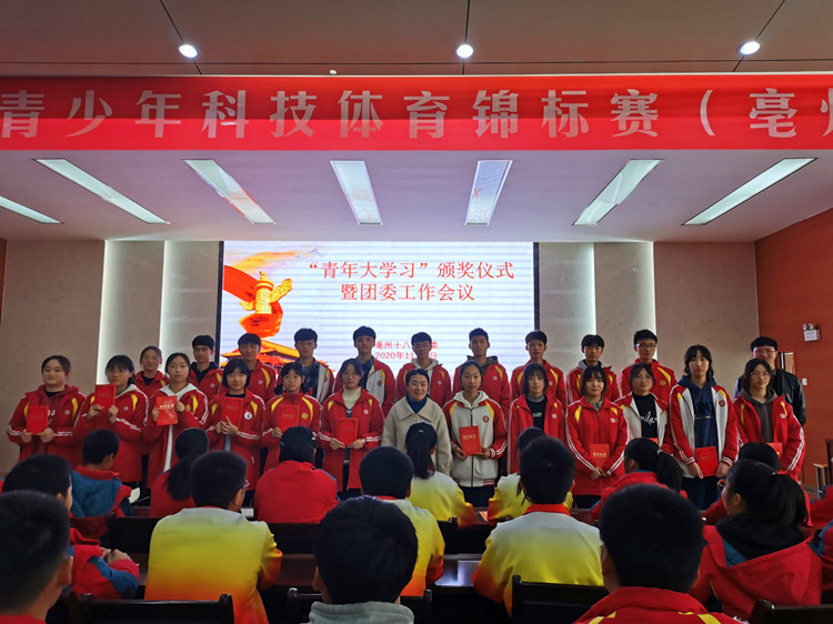 11月4日,亳州十八中团委于至真厅举行“青年大学习”颁奖仪式暨团委工作会议。会议由团委宣传委员叶金主持,团委书记陈萍、副书记倪宝、纪检委员高理想和高中部三个年级的团支部书记及国旗班全体成员参加了会议。