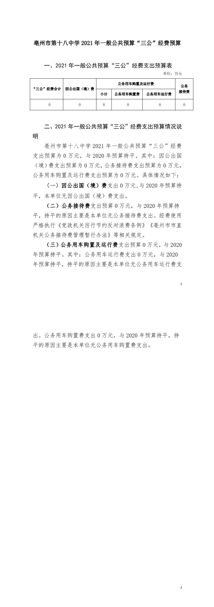 亳州市第十八中学2021年“三公”经费预算公开
