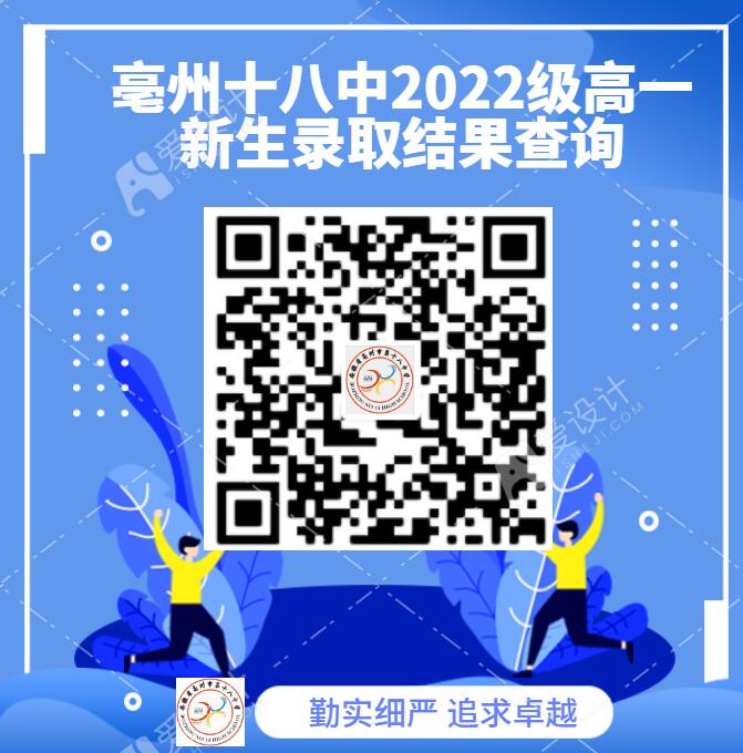 亳州十八中2022级高一新生录取结果查询 编辑:原创 发布时间:2022-07-23 17:17 浏览次数:12474次 亳州十八中2022级高一新生录取结果查询 查询方式: 1.微信或者QQ扫描二维码。 2.输入姓名及身份证号查询录取结果。 分享到: