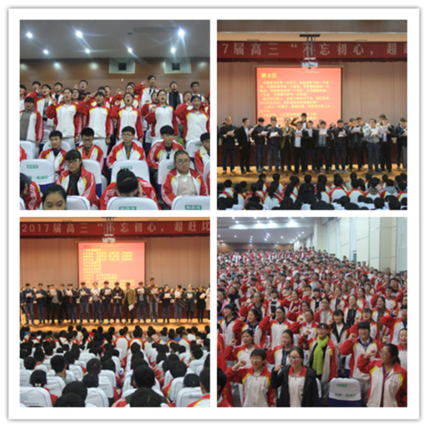 10月24日,亳州一中南校高三全体师生齐聚我校至美厅,隆重举行2017届高三“不忘初心,赶超比拼”高三动员誓师大会。此次会议由总督学郭飞峰主持。副校长马坤、梁彩霞,教导处主任戴永兴,政教处主任何立宏,后勤主任胡达高三年级部部长张震等出席会议。