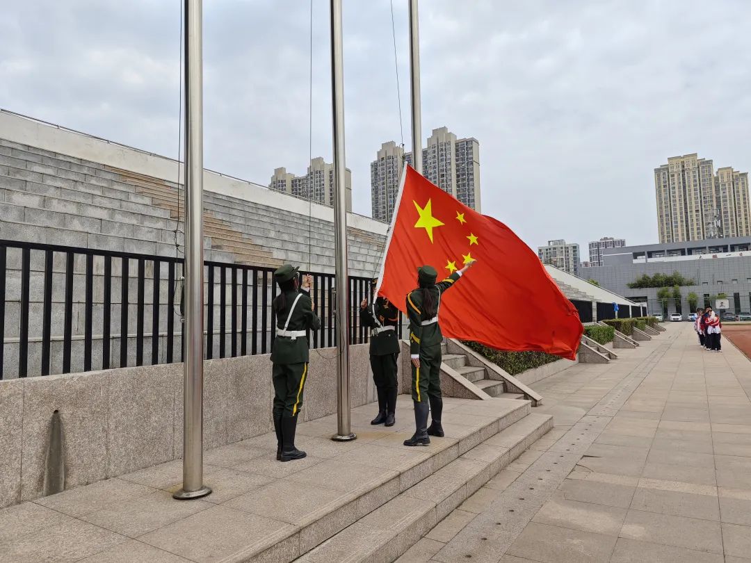 伴随着雄壮嘹亮的国歌声,鲜艳的五星红旗迎着朝阳冉冉升起,全体师生整齐肃立,齐唱国歌,向国旗行注目礼。