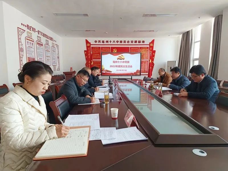 2月19日上午,亳州十八中党委召开2022年度民主生活会,市教育局招生考试中心主任侯广宇、副主任王岩到会指导。党委书记、校长李俊主持会议并作表态发言。
