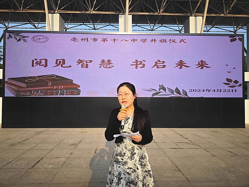 4月22日,亳州十八中在操场举行“阅见智慧,书启未来”主题升旗仪式。仪式由叶金老师与高三(19)班的张瑞雪同学主持。