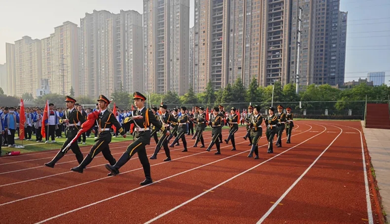 清晨,阳光洒满校园,升旗仪式在庄严的国歌声中拉开帷幕,鲜艳的五星红旗冉冉升起,迎风飘扬。全场师生肃立,向国旗行注目礼,表达对祖国的热爱与敬意。