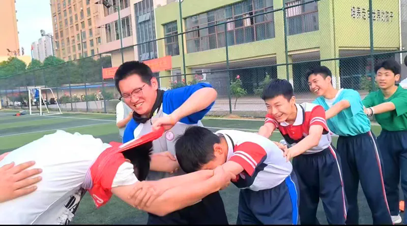 同学们手拉手围成一个大圆圈,跟着音乐的节奏摇摆,随着老师的指令绽放出一朵朵更大的桃花。在欢声笑语中,学生们的压力与烦恼瞬间化为乌有。