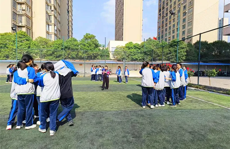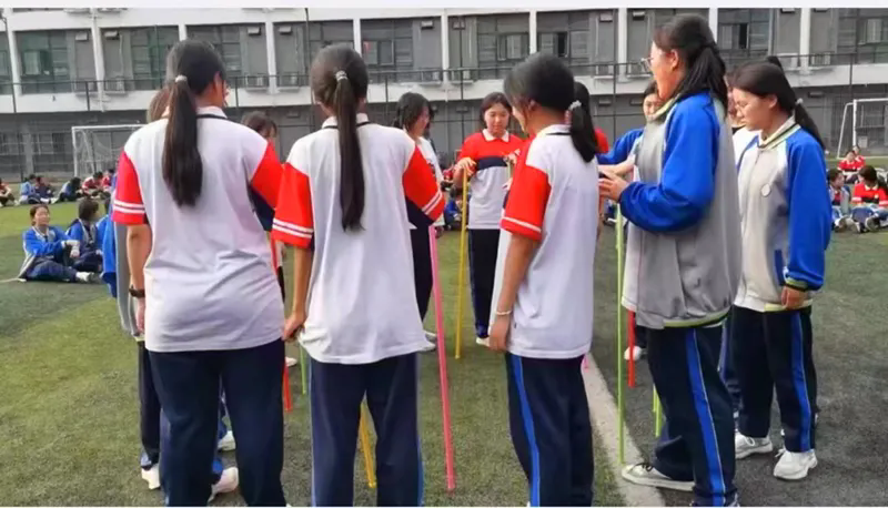游戏规则是让学生围成一圈,按照命令迅速移动步伐,队员之间相互配合,保持杆的直立。在尝试连续多次杆不倒的过程中,学生需要战胜紧张情绪,挑战自我极限,从而提升个人心理素质。