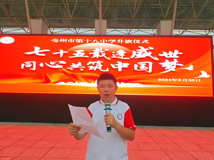 为庆祝中华人民共和国成立75周年,9月30日清晨,亳州十八中举行了“七十五载逢盛世,同心共筑中国梦”国庆节主题升旗仪式。全校师生共同参与,以最庄重的方式向祖国母亲表达深情的祝福和崇高的敬意。仪式由叶金老师与八(4)班曾昭轩同学主持。