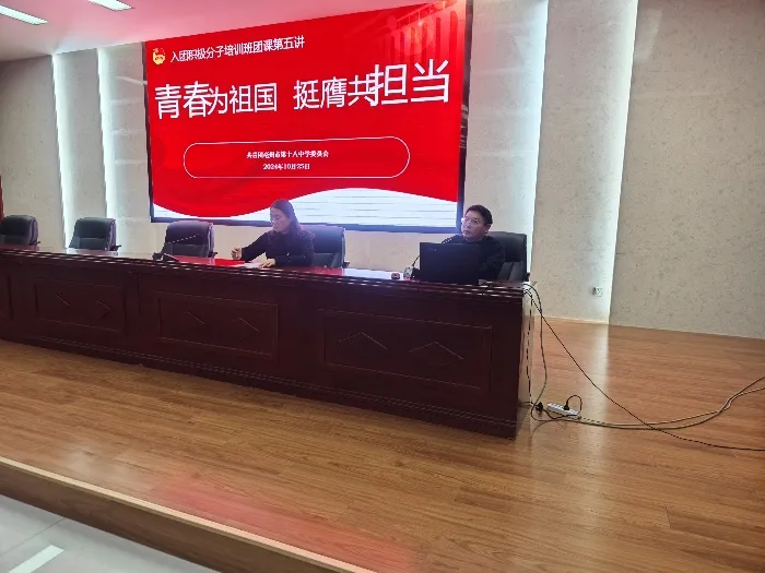 为深入学习贯彻习近平新时代中国特色社会主义思想,激发青年团员的责任感和使命感,10月25日傍晚,亳州十八中在至真厅举行入团积极分子团课——《青春为祖国,挺膺共担当》。本次团课由团委负责人陈萍主讲,团委组织委员刘年才主持,2024年秋季学期入团积极分子参加了会议。