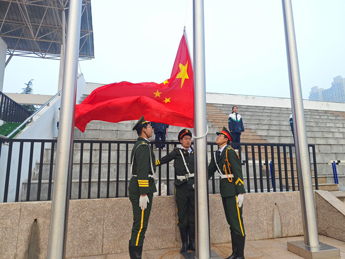 清晨,随着激昂的出旗音乐响起,旗手们迈着整齐有力的步伐,护送着鲜艳的五星红旗走向升旗台。在雄壮的国歌声中,五星红旗缓缓升起,全体师生面向国旗肃立,行注目礼,高唱国歌,心中满怀着对祖国的热爱和敬意。