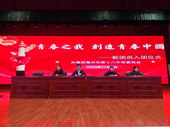 11月7日,亳州十八中在至美厅举行2024年秋季学期新团员入团仪式。仪式以“青春之我 创造青春中国”为主题,共有182名学生正式加入中国共产主义青年团。本次仪式由校团委副书记叶金主持,校长李俊、副校长王素云、团委负责人陈萍出席会议。