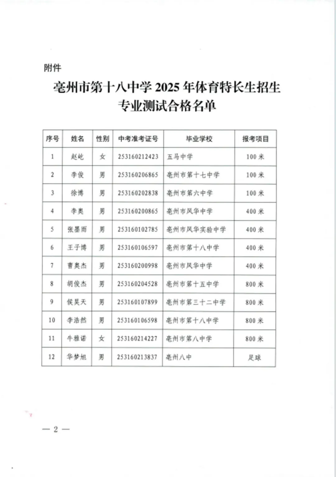 【通知公告】亳州市第十八中学2025年体育特长生招生专业考核结果公示