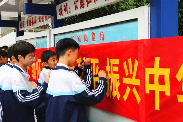 默哀仪式结束后,学生们纷纷走到印有“铭记历史 缅怀先烈 珍爱和平 振兴中华”的横幅前,郑重签下自己的名字。一笔一画不仅是对历史的铭记,更是对守护和平、振兴中华的庄严承诺。
