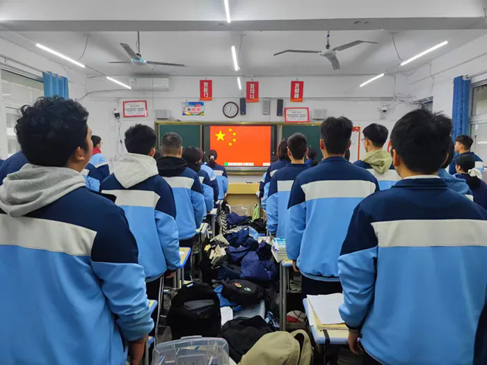 伴随着激昂的《义勇军进行曲》,全体师生肃立致敬,注视着室内电子屏上鲜艳的五星红旗,高唱国歌,嘹亮的歌声在各班级教室中回荡。