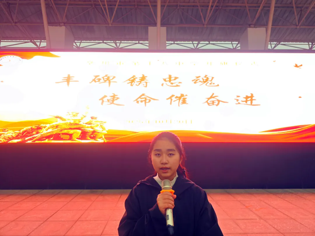 七年级(10)班赵恩琪同学作了以《丰碑铸忠魂,使命催奋进》为题的国旗下讲话。她深情回顾了75年前中国人民志愿军为维护和平,毅然跨过鸭绿江奔赴抗美援朝前线英勇作战的英雄壮举。她呼吁同学们以抗美援朝英雄为榜样,传承爱国精神,把爱国情、强国志、报国行融入日常的每一步。