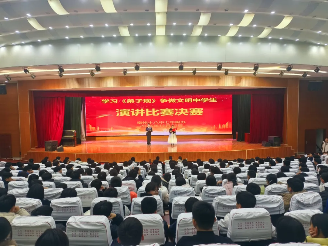 为弘扬中华优秀传统文化,推进校园精神文明建设,11月21日下午,亳州十八中七年级在学校至美厅举行“学习《弟子规》,争做文明中学生”主题演讲比赛。全体七年级师生齐聚赛场,共赴一场经典与文明的青春之约。