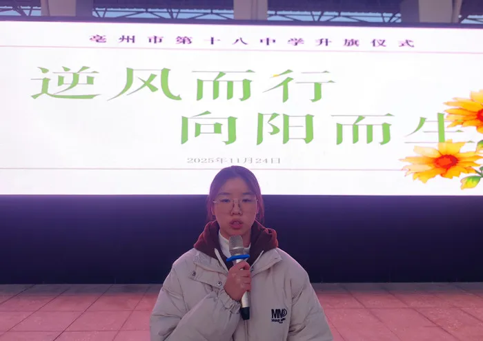随后,来自高一(1)的学生代表孙悦悦发表了国旗下讲话。她指出,学习征程中遇到的难题与挫折,恰如“逆风”,是锤炼我们飞得更高的“磨刀石”;而“向阳而生”则体现在每一次请教、每一次探讨、每一次倔强执笔的微小行动中,那是我们心中不灭的求知之光与成长渴望。她号召全体同学不惧风雨,永葆锐气,将个人的奋斗融入时代的洪流,不仅要做学业上的奋进者,更要做民族复兴伟业的接力者,让青春在为祖国、为人民的奉献中焕发出最绚丽的光彩。
