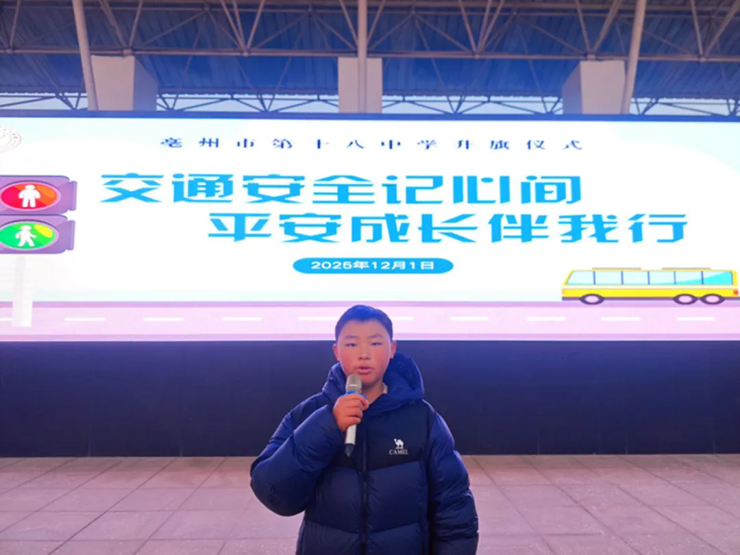 为全面强化师生的交通安全意识,构建平安和谐校园,12月1日早晨,全国交通安全日来临之际,亳州十八中在学校操场举行以“交通安全记心间,平安成长伴我行”为主题的升旗仪式。学校领导、各处室及年级办负责人、全体班主任和在校学生参与了本次活动。