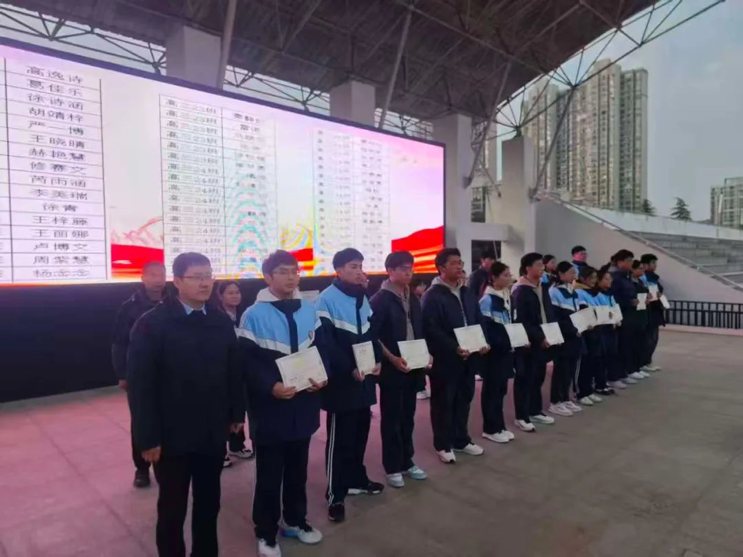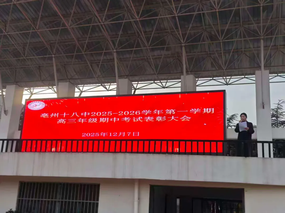 12月7日,亳州第十八中高三年级期中考试总结表彰大会在学校操场举行。本次大会是对11月份“稳节奏、 强意志、 寻突破、 做榜样”主题活动月的深入总结与成果展示,旨在表彰先进、凝聚共识,激励全体高三学子在备战高考的道路上坚定前行。