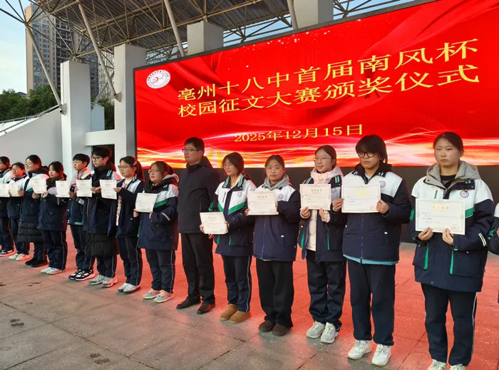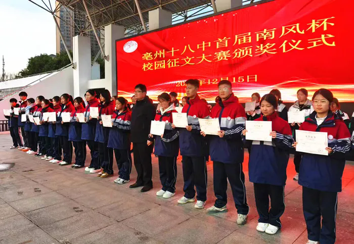 12月15日,亳州十八中在学校操场举行首届“南风”杯校园征文大赛颁奖仪式。校长李俊为获奖同学和年级颁奖并表示祝贺。
