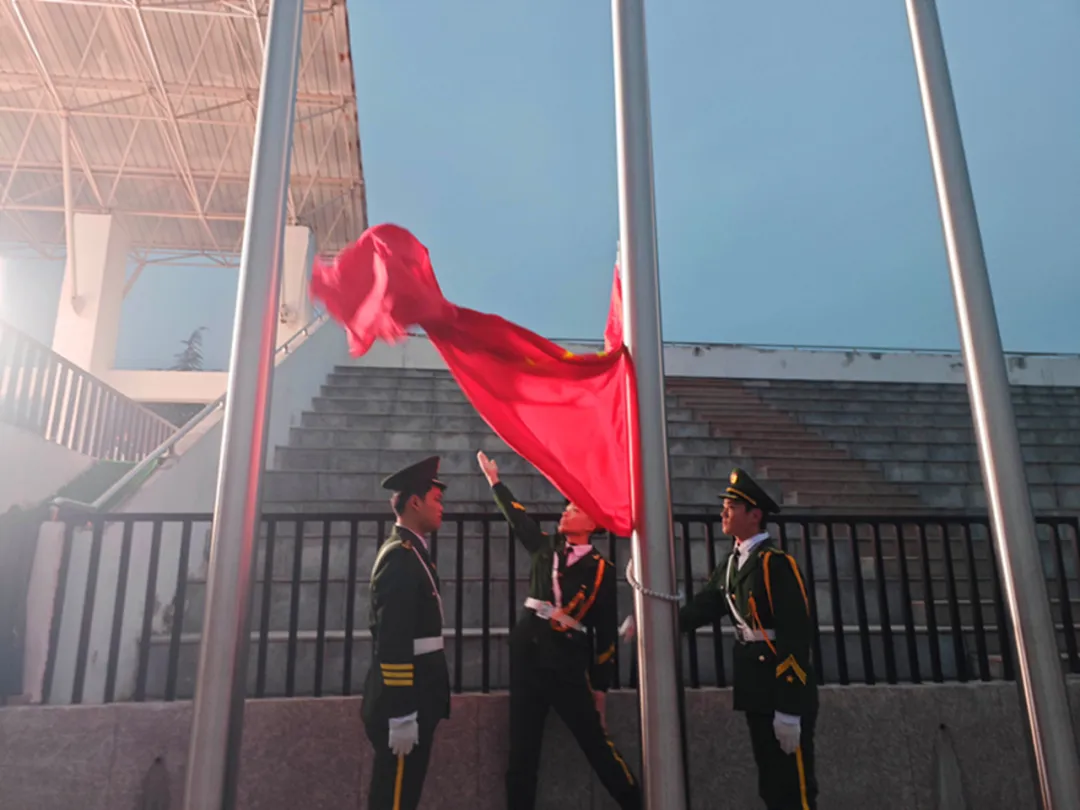 仪式在雄壮的国歌声中拉开帷幕。全体师生面向冉冉升起的五星红旗肃立致敬、齐唱国歌,激昂的旋律响彻校园,点燃了清晨的活力与激情。