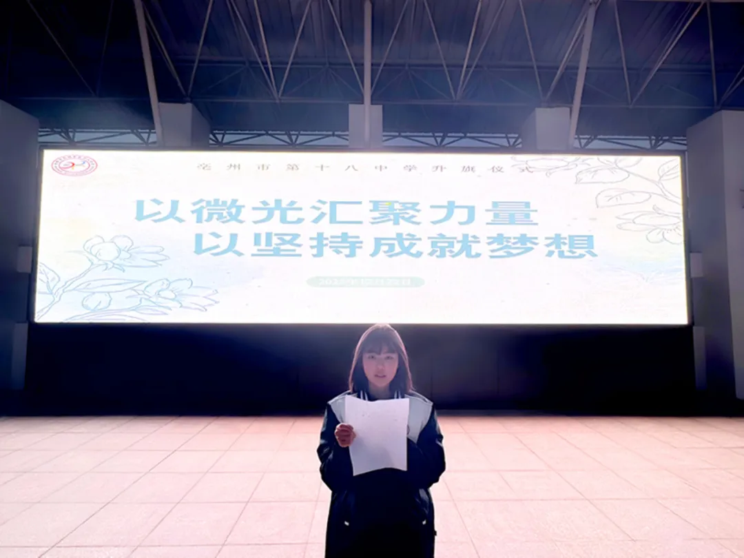 晨光熹微,红旗招展。12月22日清晨7时,亳州十八中师生齐聚学校操场,举行“以微光汇聚力量,以坚持成就梦想”主题升旗仪式。学校领导、各处室及年级办负责人、全体班主任与在校学生共同参与了本次仪式。