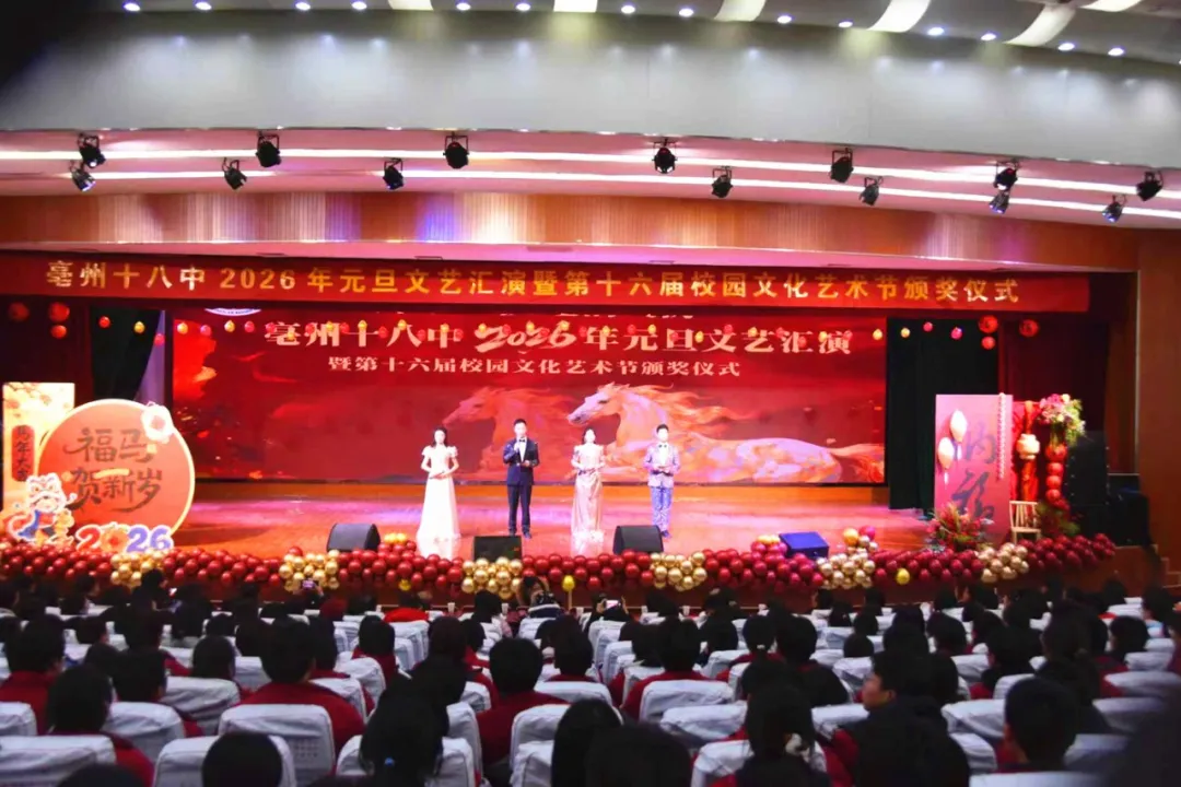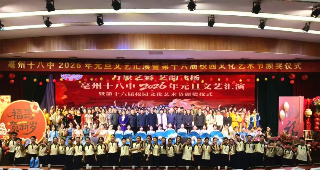 岁序更替,华章日新。12月31日,亳州十八中举行2026年元旦文艺汇演暨“万象艺彩 艺韵飞扬”第十六届校园文化艺术节颁奖仪式。师生齐聚,艺彩纷呈,以飞扬的才情与饱满的热情,共庆旧岁丰稔,同启新年序章。