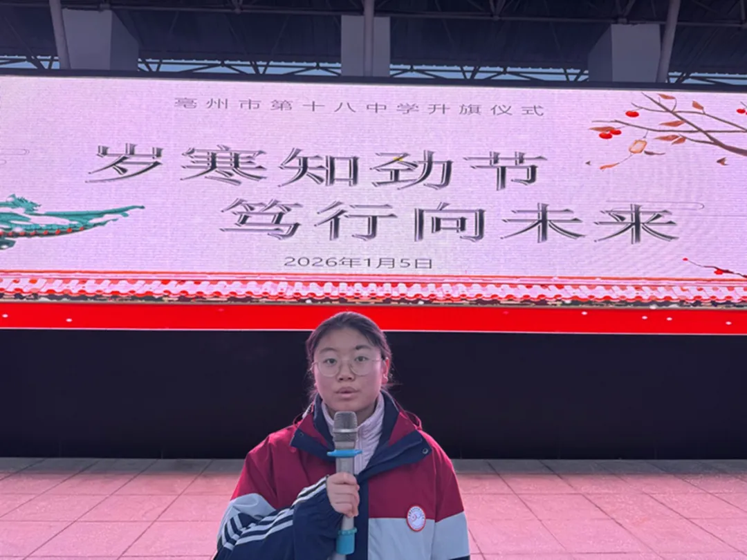 凛冬晨晖映校园,劲节初心赴新程。为凝聚文明力量,砥砺成长初心,2026年1月5日清晨,亳州十八中高中部全体师生齐聚操场,举行以“岁寒知劲节,笃行向未来”为主题的升旗仪式。校长何立宏携领导班子成员参加仪式。