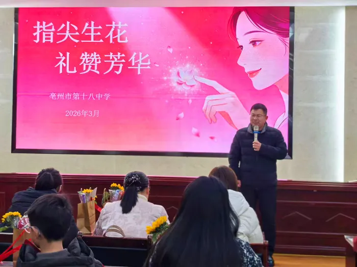 活动伊始,校长何立宏发表了简短而深情的致辞。他代表学校向辛勤耕耘在教学、管理、服务等各个岗位上的女教职工致以最诚挚的节日问候和崇高的敬意。他指出“亳州十八中的高质量发展离不开每一位女教职工的坚守与奉献,你们既是三尺讲台上传道授业的良师,也是家庭中温柔坚韧的守护者”。校长寄语全体女教职工,在忙碌的工作之余,要学会关爱自己,保持从容心态,在生活中绽放别样光彩,继续以巾帼之姿为学校发展贡献力量。