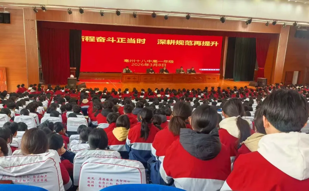 3月8日下午,亳州十八中高一年级召开新学期全体学生大会。本次大会以“新程奋斗正当时,深耕规范再提升”为主题,年级主任袁小磊、各分管副主任及全体高一班主任出席会议。