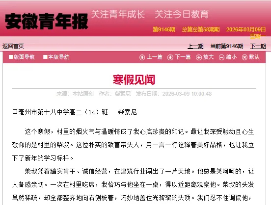 点评:本文以寒假返乡见闻为切入点,通过细节描写,将柴叔踏实认真、奉献担当的品格具象化,塑造了一个既接地气又令人敬佩的村民榜样。同时,作者在反思中萌生“见贤思齐”的自觉,折射出新时代青年学子向上向善的精神风貌。柴索尼热爱文学,是校“南风”文学社成员,曾获叶圣陶杯全国中学生新作文大赛省级二等奖。(辅导教师 任相茹)