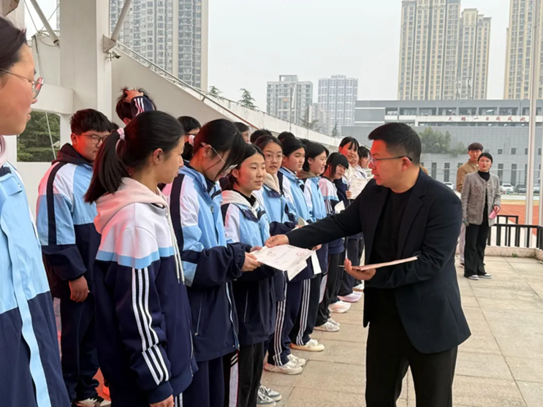 赛场展风采,拼搏砺精神。仪式上,学校对在全市中小学班级体育课集体对抗赛中获奖的集体进行表彰。校长何立宏为获奖同学颁发奖状并合影。学校八年级学子在拔河、接力等多项团体项目中奋勇争先,荣获初中组一等奖第一名。校长勉励全体同学以优秀学子为榜样,把赛场拼搏精神转化为学习动力,追求卓越、勇攀高峰。