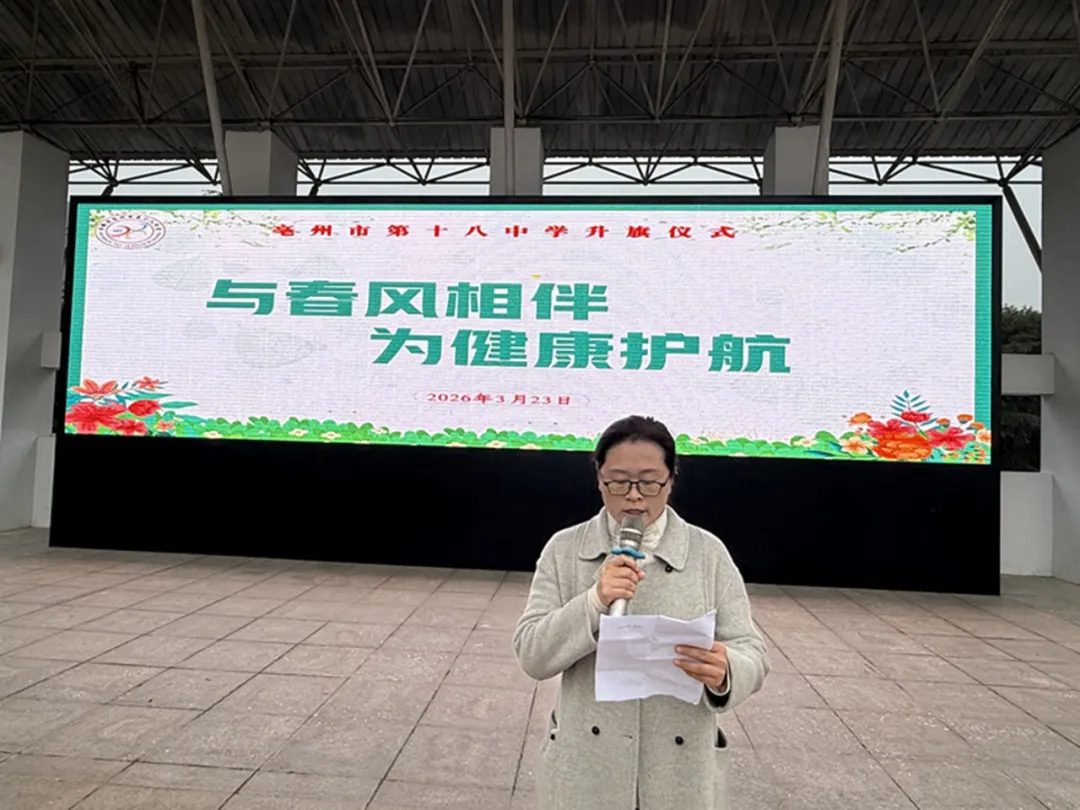 在第31个世界防治结核病日来临之际,3月23日清晨,亳州第十八中学初中部举行“与春风相伴,为健康护航”主题升旗仪式。仪式将爱国主义教育、健康安全教育、榜样激励教育与感恩教育融为一体,为春日校园注入奋进力量。